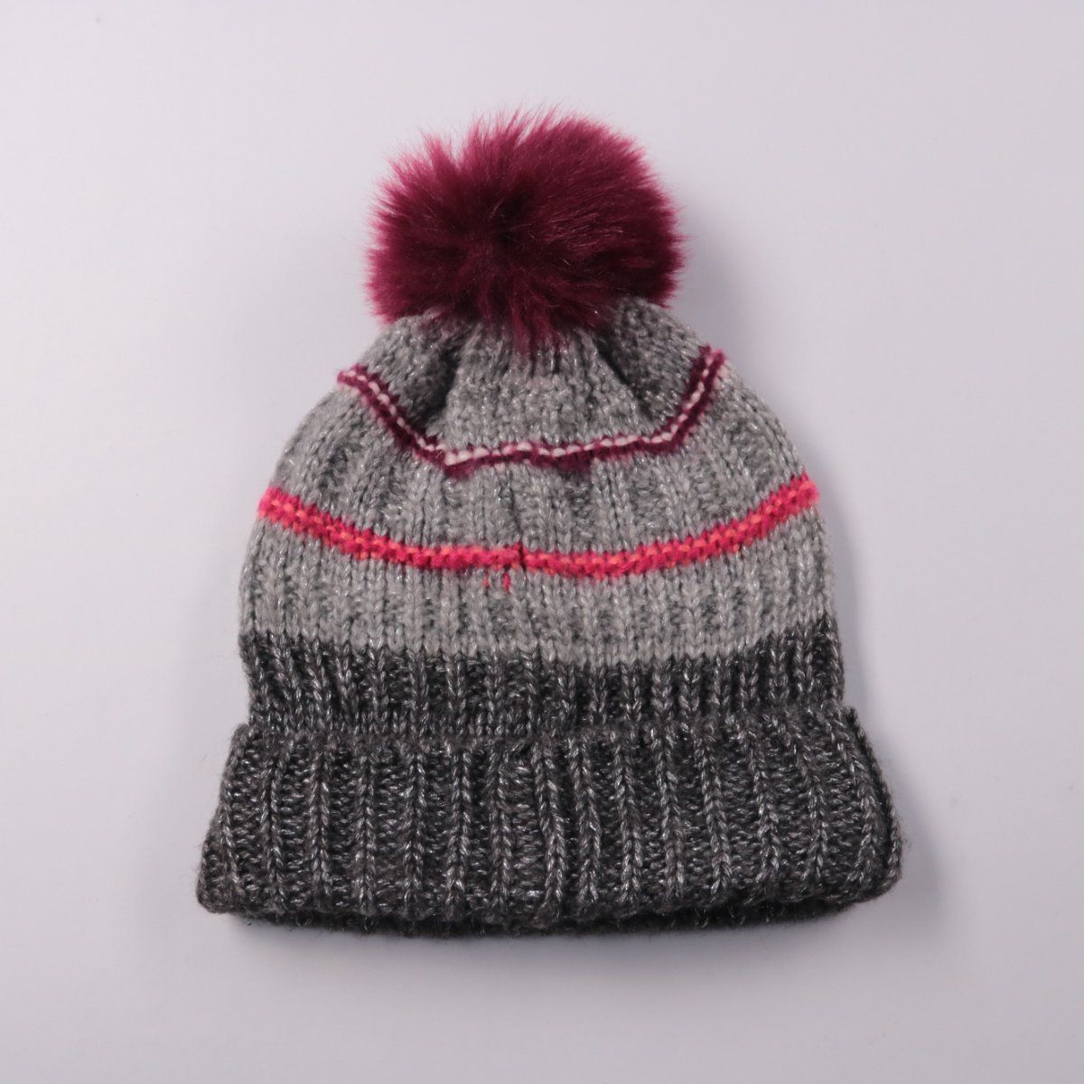 Вязаная шапка Gap с помпоном и полосками, подойдёт для холодной погоды и зимних прогулок. Универсальная модель в серых тонах легко сочетается с куртками и пуховиками. Плотная вязка хорошо держит тепло и закрывает уши.