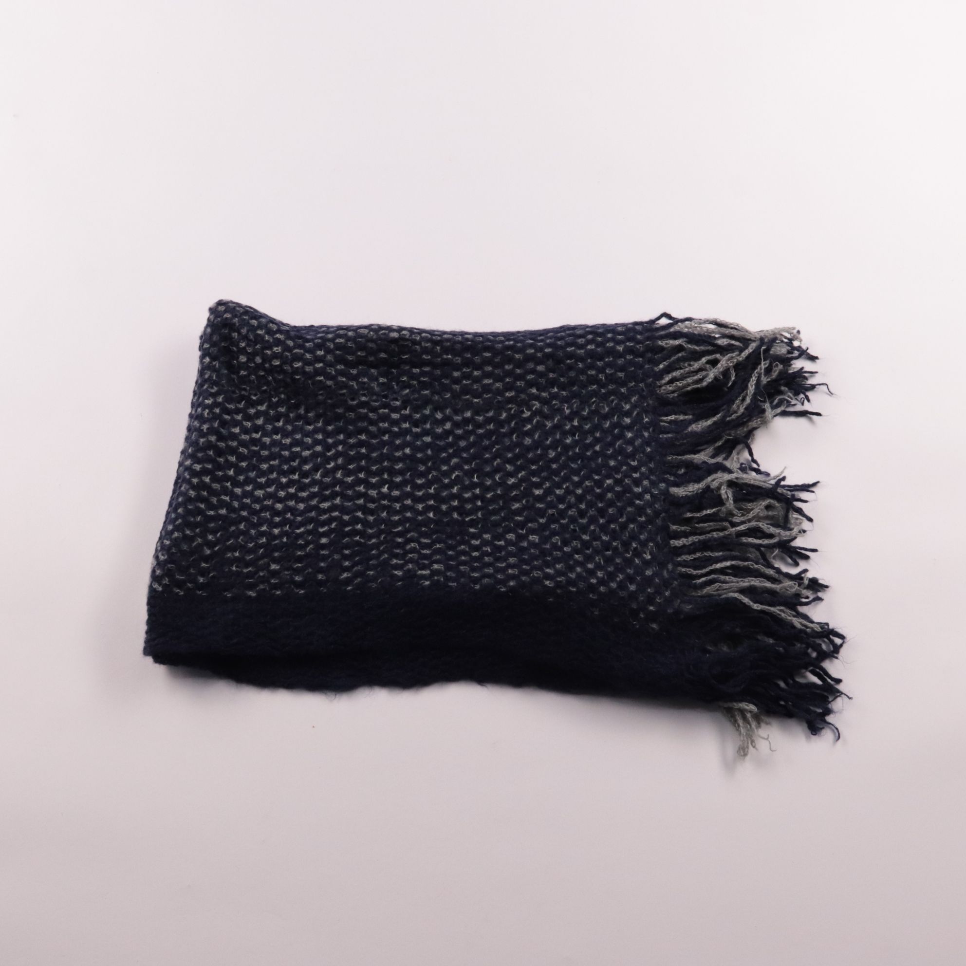 Вязаный шарф из акрила тёмно-синего цвета с серой фактурной нитью и бахромой по краю. Подойдёт для зимних прогулок и повседневных образов, хорошо сочетается с пальто и пуховиком. Акрил практичен в уходе и быстро сохнет после стирки.