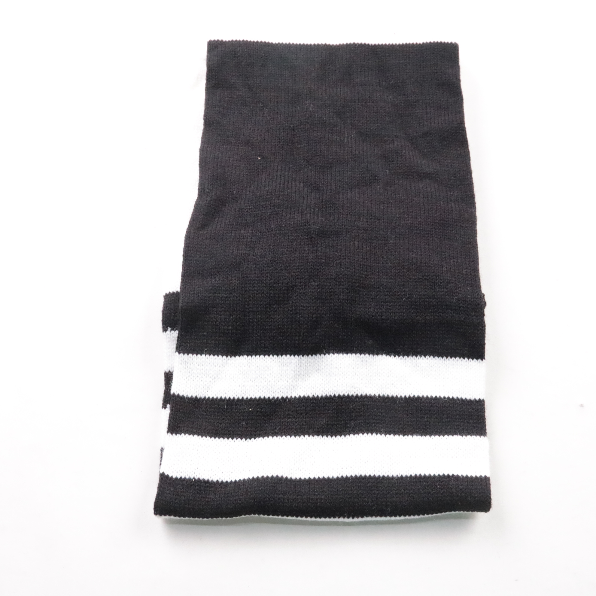 Трикотажный шарф в чёрно-белую полоску без указания бренда. Подойдёт для повседневных образов в прохладную погоду и легко сочетается с тёмной верхней одеждой. Мягкий материал комфортно лежит на шее и не занимает много места в сумке.