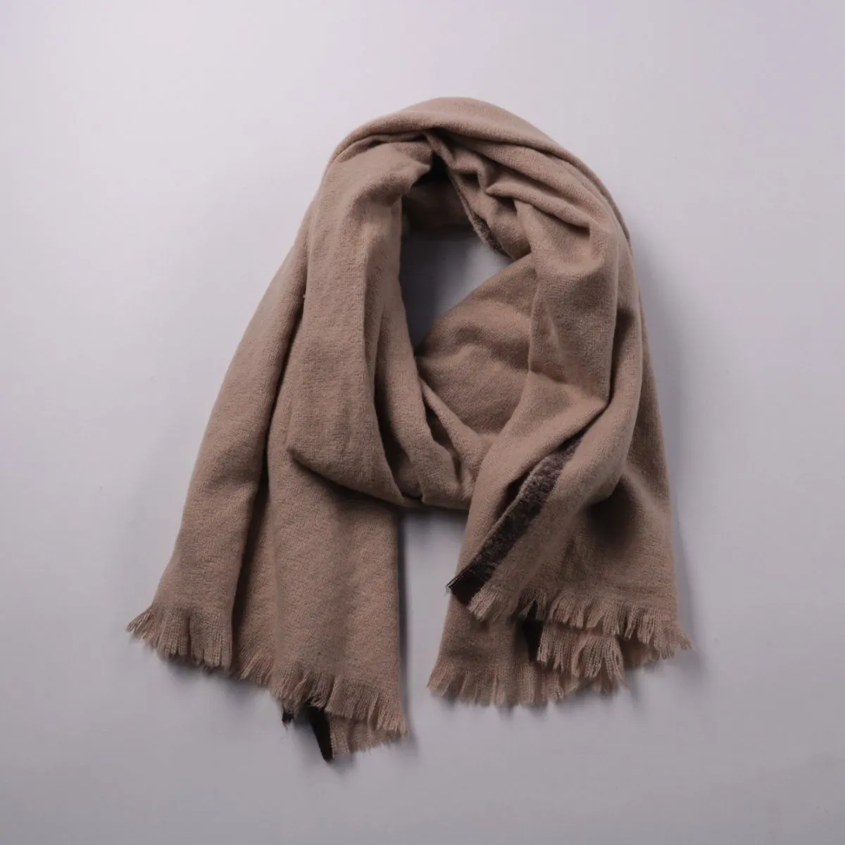 Шарф бежевого цвета с бахромой и контрастной полосой по краю. Подойдёт для повседневных образов и в прохладную погоду, можно носить как классический шарф или накидывать на плечи. Практичный нейтральный оттенок легко сочетается с верхней одеждой разных цветов.