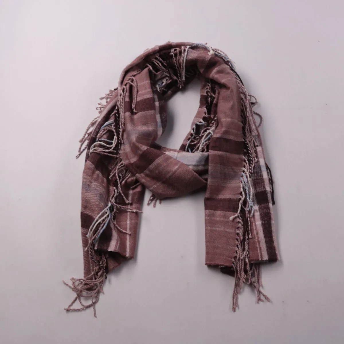 Шарф в клетку с бахромой по краям, без видимых логотипов. Подойдёт для повседневных образов в прохладную погоду и удобно драпируется за счёт мягкой ткани. Практичен тем, что добавляет тепло и защищает шею от ветра.
