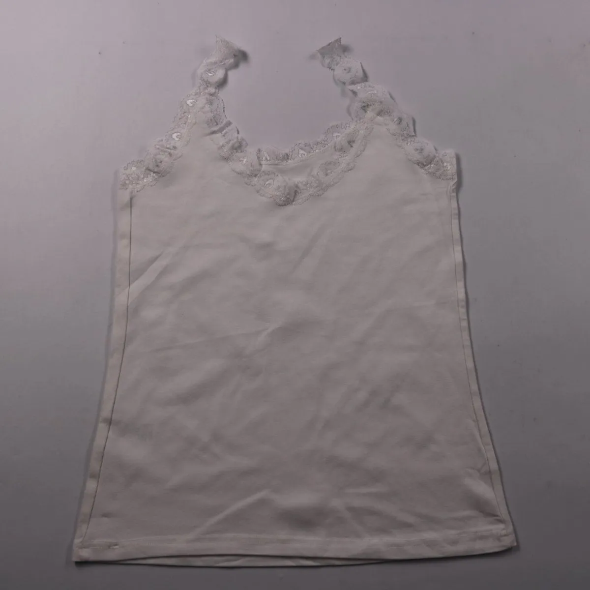 Детская белая майка George на тонких бретелях с кружевной отделкой по верху. Подойдёт как нижний слой под школьную одежду или для дома в тёплое время. Хлопковая ткань с эластаном тянется и комфортно сидит.