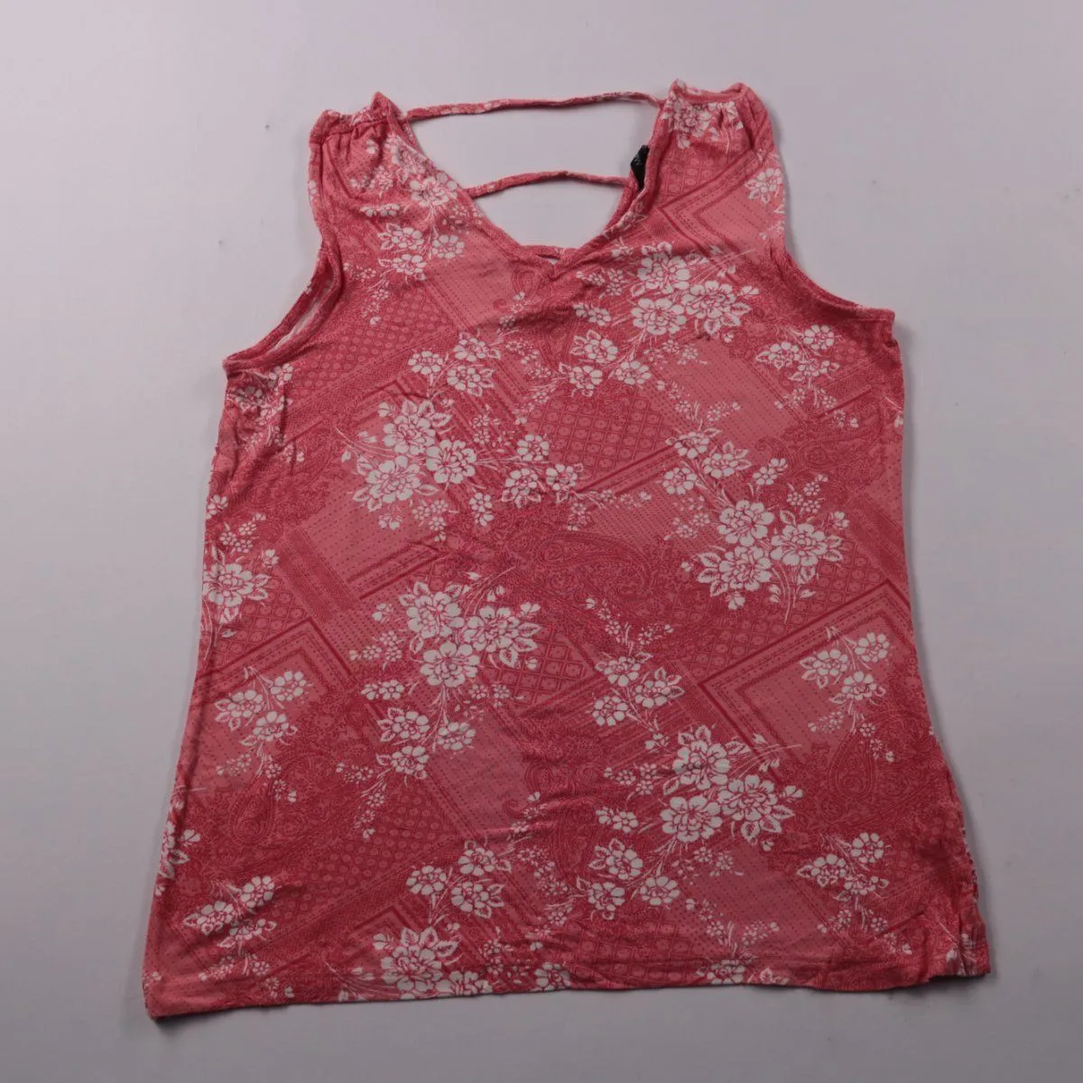 Топ M&Co кораллово-розового цвета с белым цветочным принтом и открытой спинкой на тонких лямках. Подойдёт для лета, прогулок и занятий в помещении. Ткань тянется и не сковывает движения.