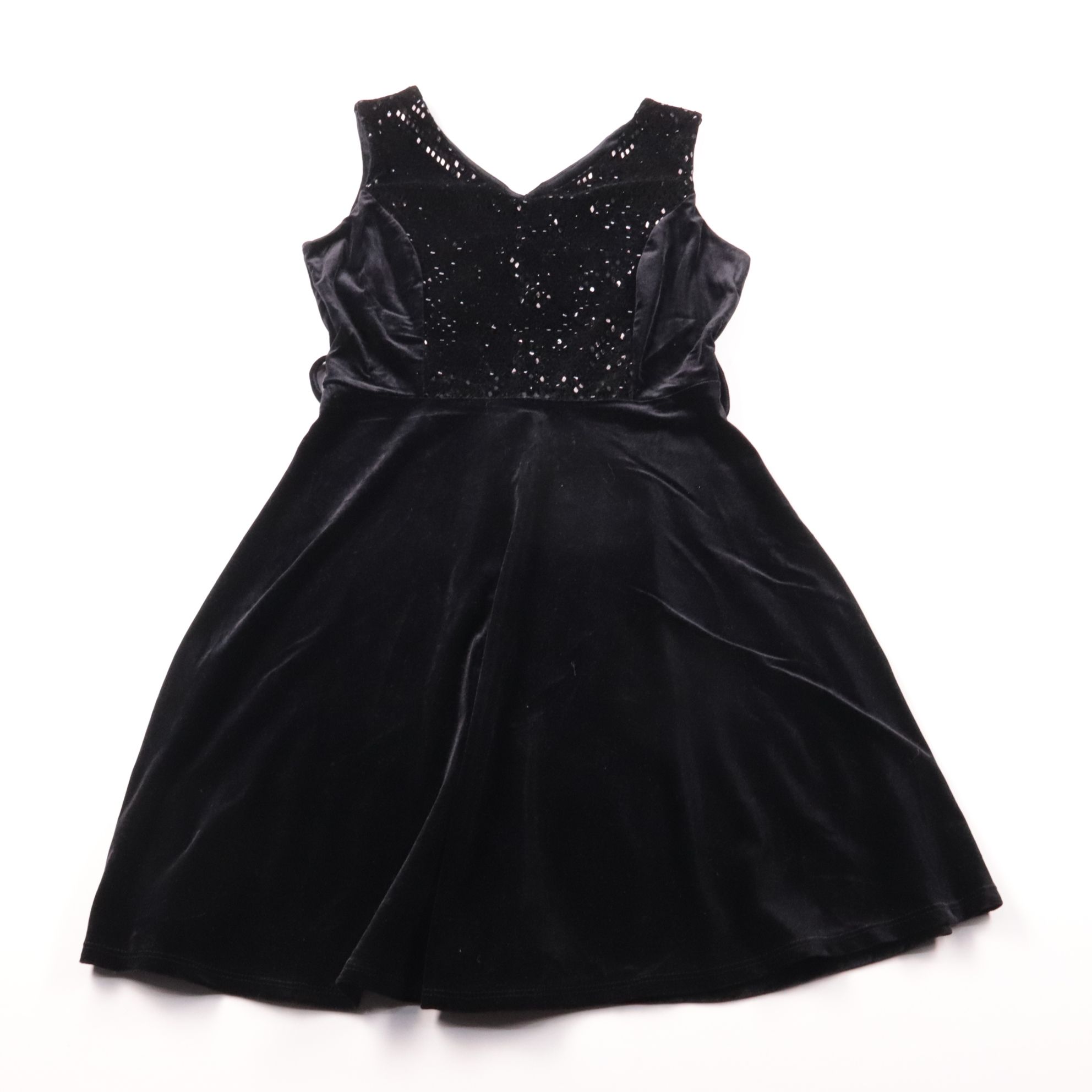 Чёрное платье Hails из бархатистой ткани с блёстками на лифе и V-образным вырезом. Подойдёт для утренников, праздников и фотосессий. Ткань мягкая и приятная к телу, хорошо смотрится в движении за счёт расклёшенной юбки.