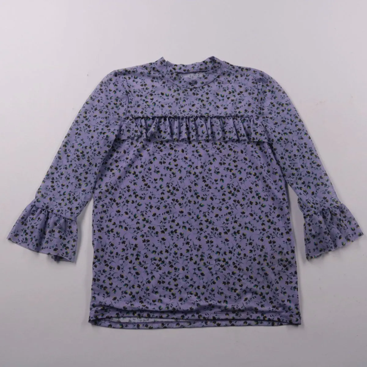 Детское платье с длинным рукавом и воланом на груди, ткань с мелким цветочным принтом. Подойдёт для повседневной носки в садик или школу в прохладную погоду. Практично тем, что лёгкое и не сковывает движения.