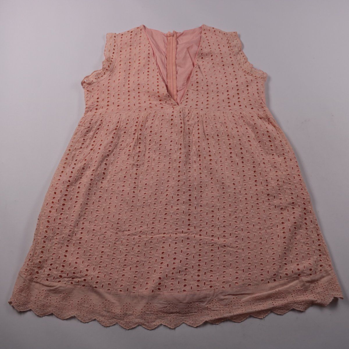 Детское платье без рукавов из розовой ткани с ажурной вышивкой (прошва) и фигурным краем по низу. Подойдёт для тёплой погоды, праздников и прогулок, застёгивается на молнию сзади. Лёгкое и хорошо пропускает воздух.