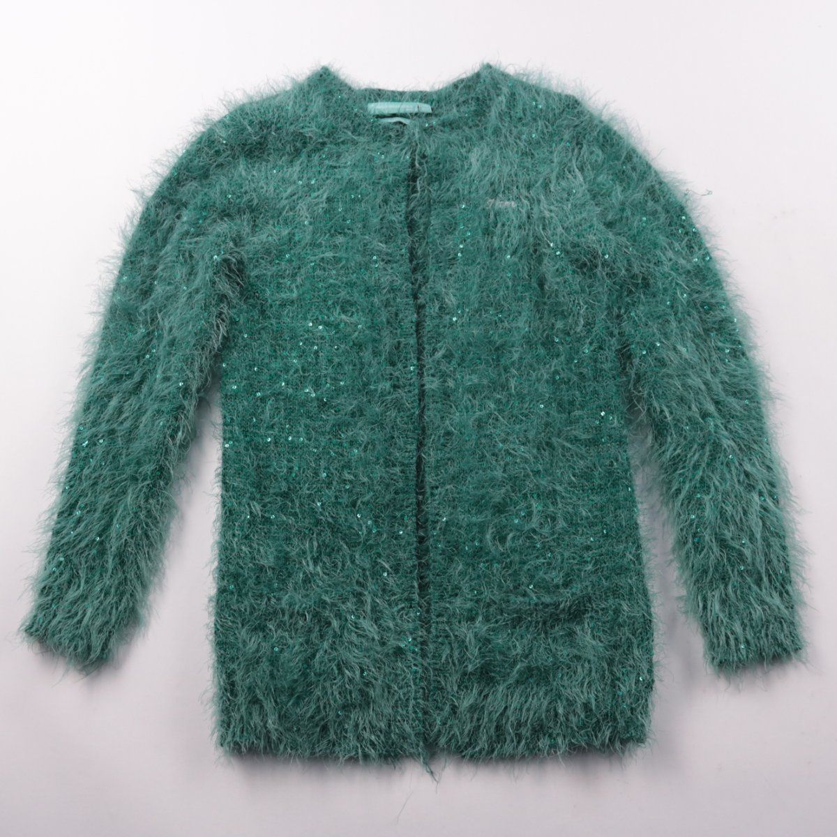 Пушистый вязаный кардиган для девочки, бренд не указан. Мягкая фактура с легким блеском подойдет для прохладной погоды в детский сад или школу. Удобно носить поверх футболки или платья — хорошо сохраняет тепло.