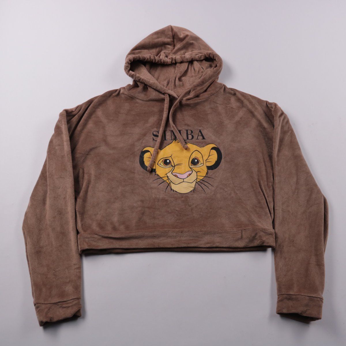 Укороченная велюровая толстовка Disney The Lion King с капюшоном и принтом Симбы. Подойдёт для школы, прогулок и дома в прохладную погоду, хорошо сочетается с джинсами и легинсами. Мягкий материал приятен к телу и не сковывает движения.