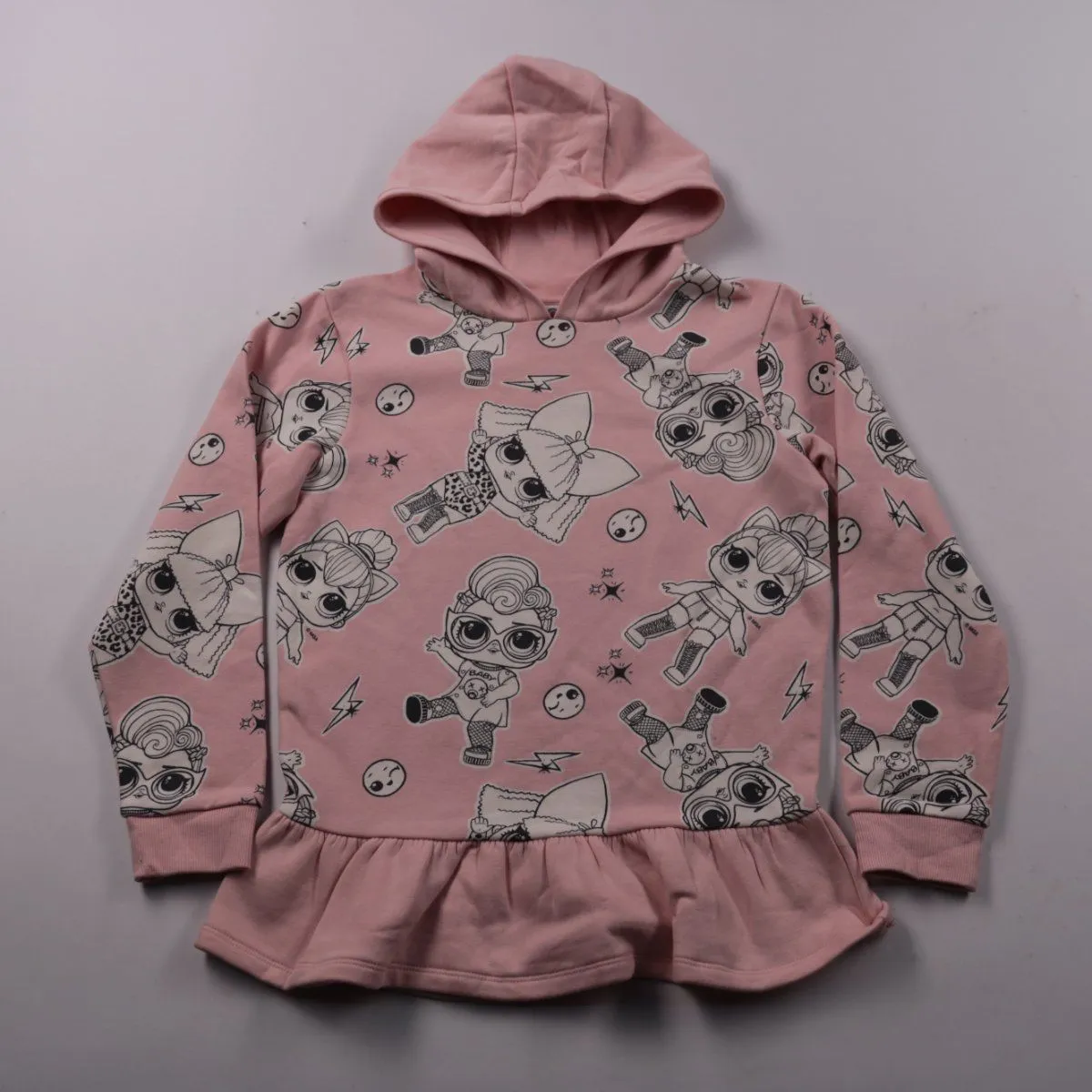 Детская толстовка LOL Surprise розового цвета с принтом и капюшоном, низ выполнен с рюшей. Подойдёт для прогулок и повседневной носки в прохладную погоду. Практичный плюс — мягкий материал и капюшон для защиты от ветра.