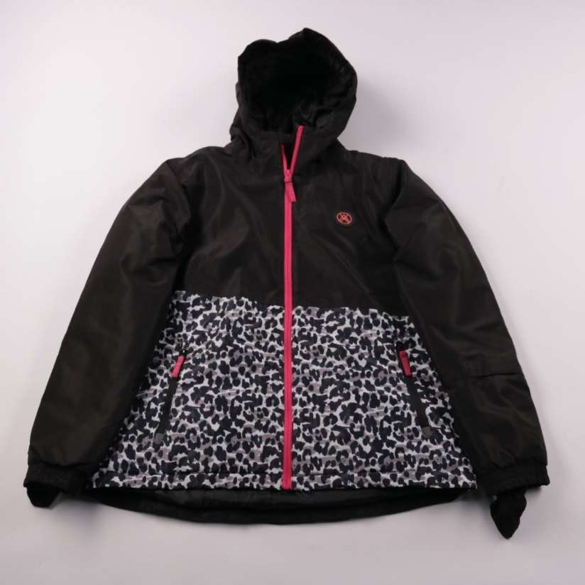 Зимняя куртка Newcential для девочки: чёрный верх с серо-белым леопардовым принтом и розовой молнией, есть капюшон. Подойдёт для прогулок в холодную погоду и активных игр на улице. Удобно, что застёгивается на молнию и есть карманы.