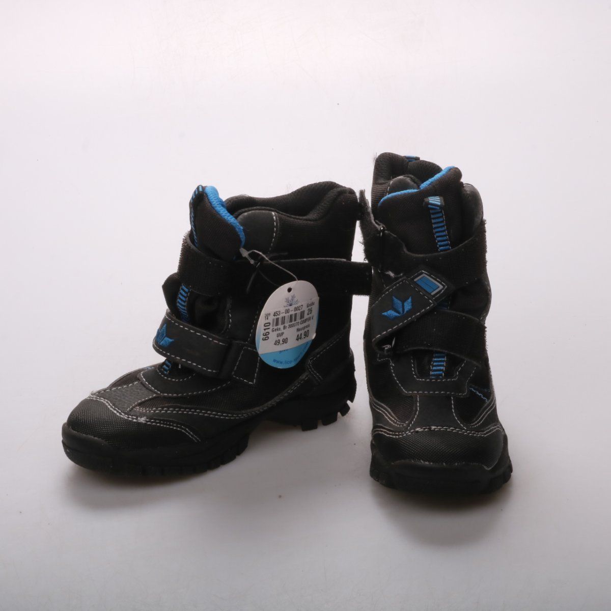 Детские зимние сапоги на липучках, бренд не указан. Чёрные с синими вставками и принтом «STOP POLICE», с тёплой подкладкой. Подойдут для прогулок в холодную погоду, рельефная подошва даёт хорошее сцепление.