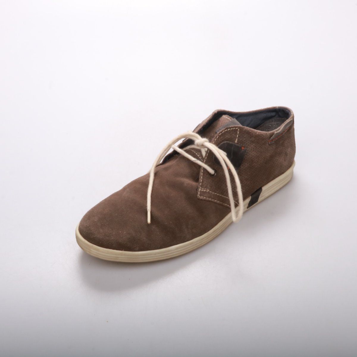 Мужские кеды Bugatti из коричневой замши на светлой резиновой подошве. Подойдут на каждый день в демисезон: к джинсам или чиносам, для города и прогулок. Резиновая подошва даёт хорошее сцепление и проще в уходе.