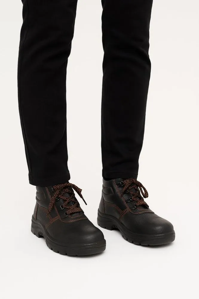 Рабочие ботинки SOGEDECA из натуральной кожи в чёрном цвете с высокой шнуровкой и плотным воротом. Подойдут для работы и повседневной носки в прохладную погоду благодаря цепкой подошве. Практичный плюс — прочная конструкция и износостойкий протектор.