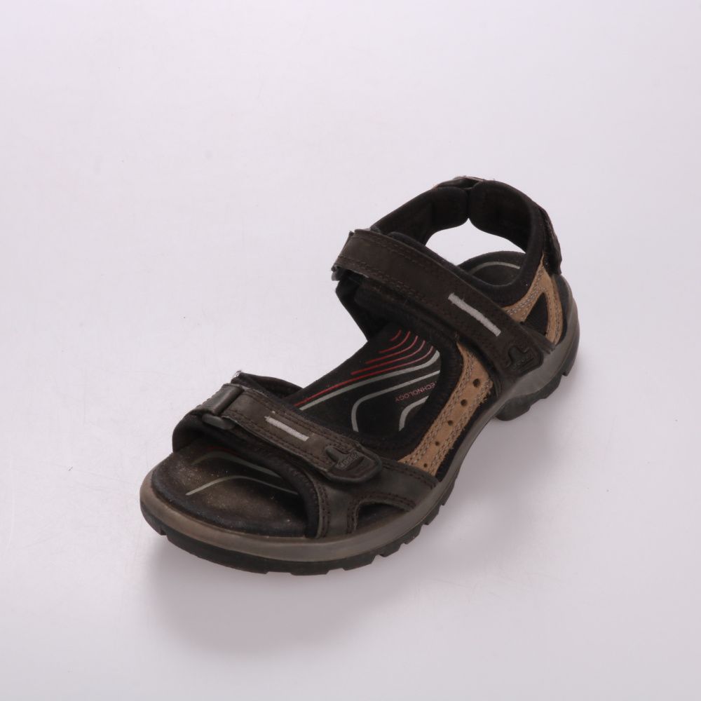 Мужские сандалии Ecco из кожи в чёрном цвете с контрастными бежевыми вставками и регулировкой на липучках. Подойдут для повседневной носки и прогулок в тёплую погоду благодаря открытой конструкции. Рельефная подошва даёт хорошее сцепление и устойчивост...