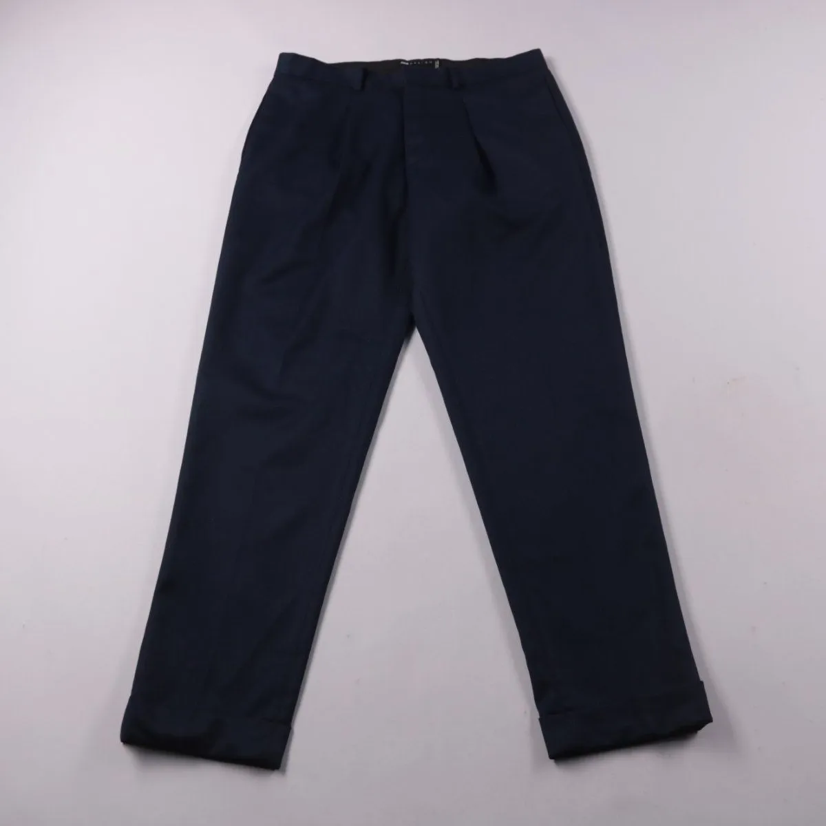 Мужские классические брюки ASOS DESIGN тёмно-синего (почти чёрного) цвета со стрелками и защипами. Подойдут для офиса и более строгих образов, низ оформлен подворотами. Ткань со стрейчем, поэтому посадка комфортнее при движении.