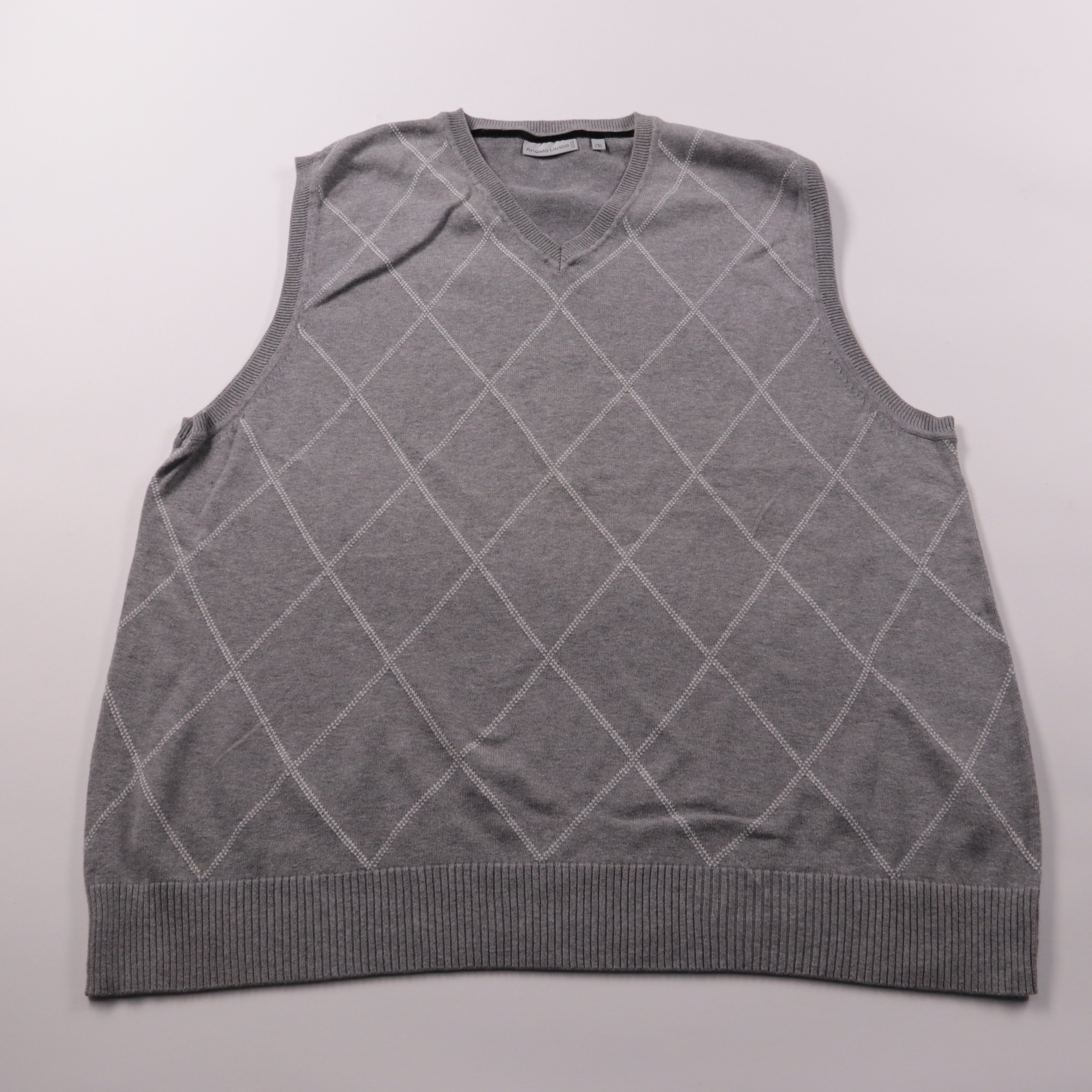 Мужской трикотажный жилет Angelo Litrico серого цвета с V-образным вырезом и ромбовидным узором. Подойдёт для офиса и повседневных образов, удобно носить поверх рубашки или лонгслива. Хлопковый материал хорошо дышит и комфортен в течение дня.