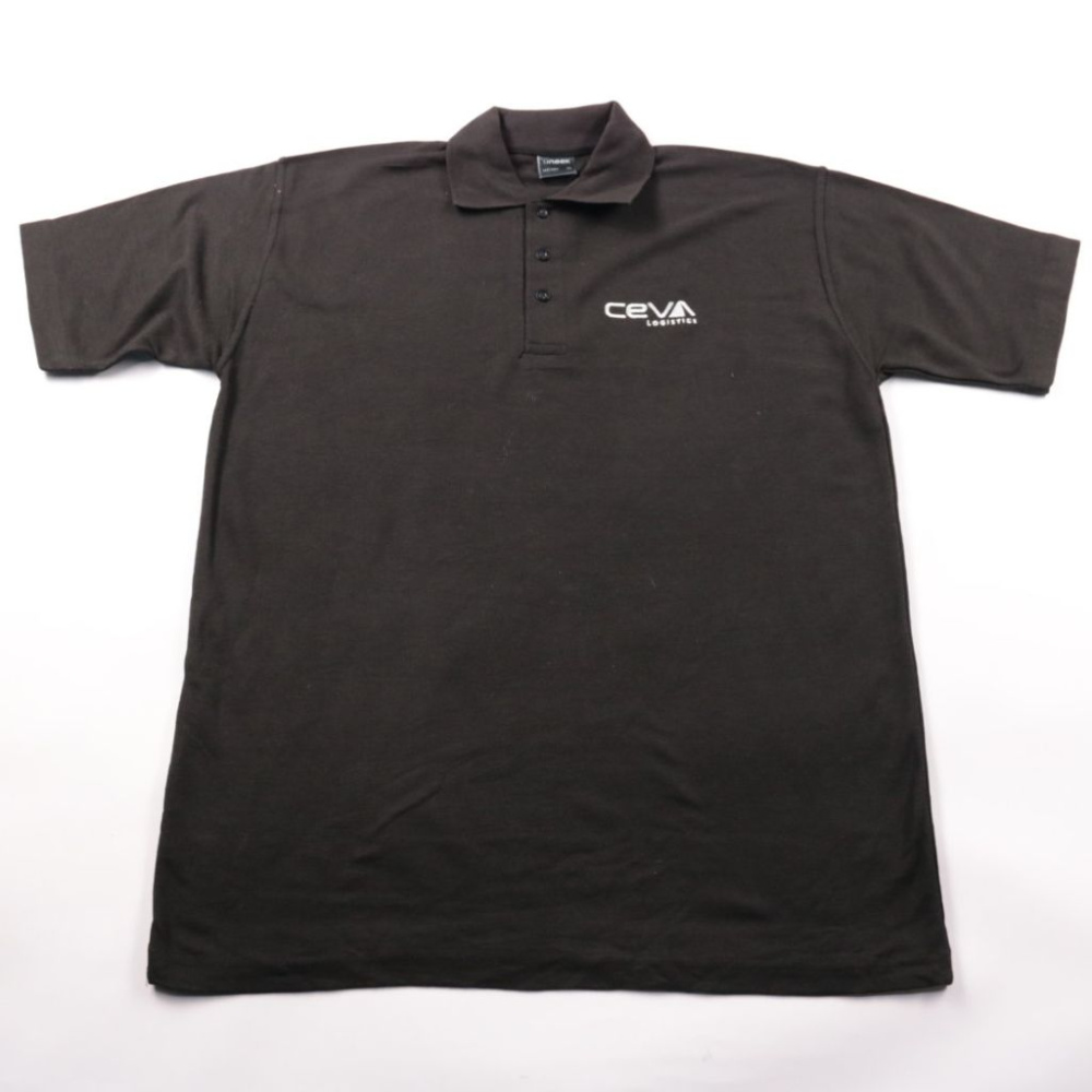 Мужское поло Uneek чёрного цвета с коротким рукавом и воротником на пуговицах, с логотипом CEVA Logistics на груди. Подойдёт для повседневной носки и как рабочая/корпоративная форма. Смесовая ткань (хлопок с полиэстером) практична в уходе и меньше мнётся.