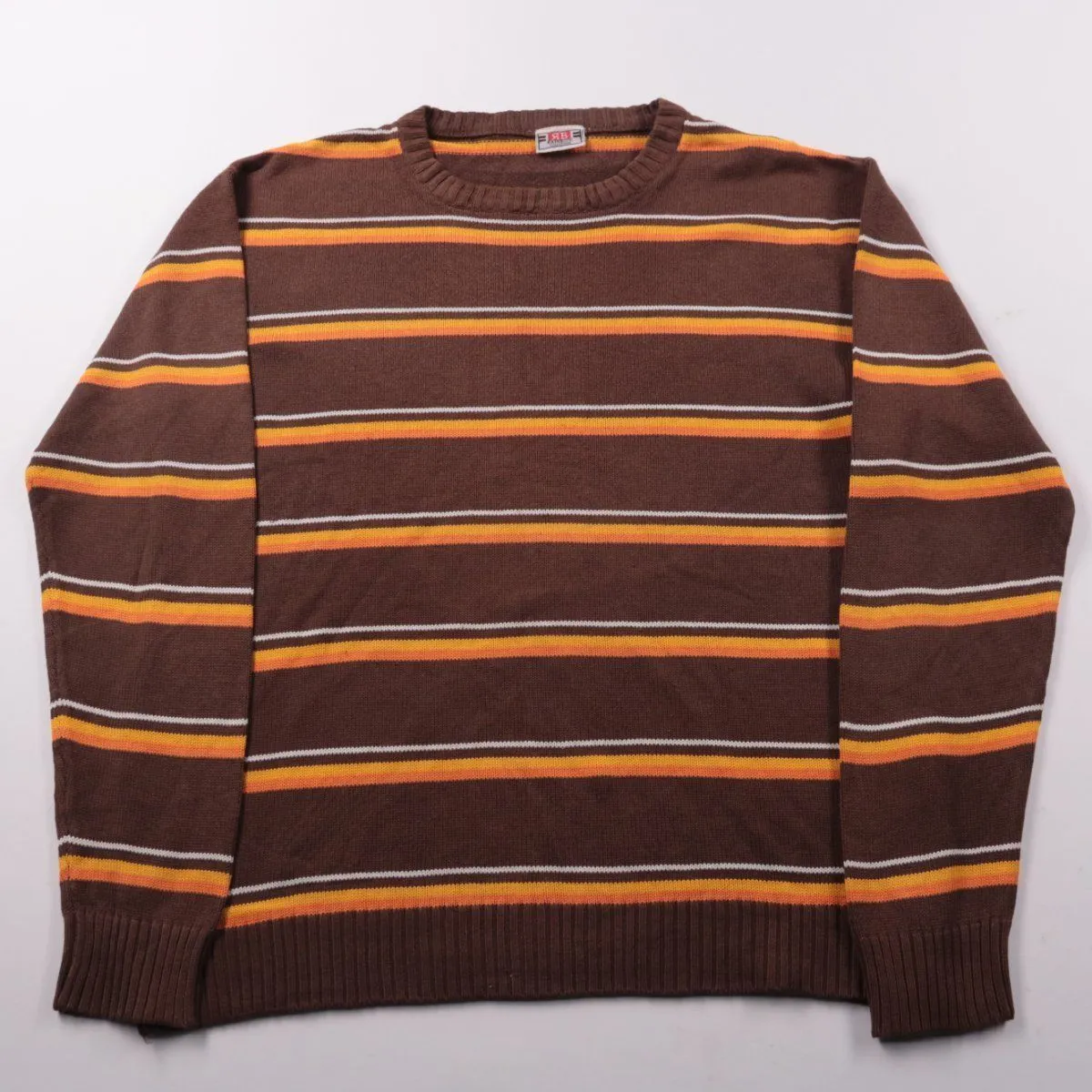 Мужской джемпер Rainbow Collection в коричневом цвете с горизонтальными полосками. Подойдёт для повседневной носки в прохладную погоду и легко сочетается с джинсами или брюками. Мягкая трикотажная ткань и манжеты/низ на резинке помогают держать форму и комфортно сидят.