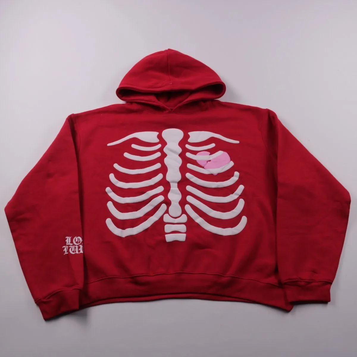 Худи BoohooMAN красного цвета с капюшоном и крупным принтом «скелет» спереди. Подойдёт для повседневной носки и стритстайла в прохладную погоду. Плотный материал с хлопком в составе хорошо держит форму и прост в уходе.