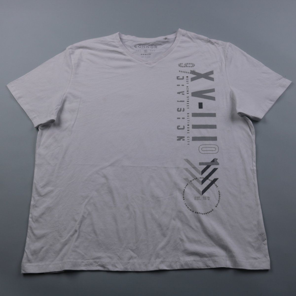 Мужская футболка Connor белого цвета с V-образным вырезом и серым принтом. Подойдёт для повседневной носки летом и в помещении круглый год. Натуральный хлопок хорошо дышит и комфортен в носке.
