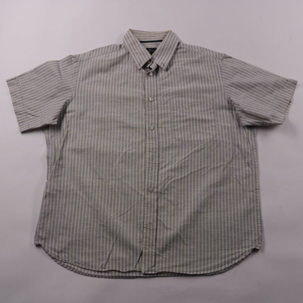 Мужская рубашка Blue Harbour с коротким рукавом и классическим воротником, выполнена из хлопка в серо-жёлтую полоску. Подойдёт для лета и офиса в стиле casual, хорошо смотрится с джинсами или чиносами. Натуральная ткань дышит и комфортна в жару.