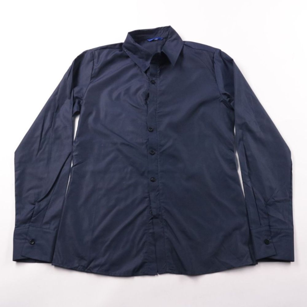 Мужская рубашка тёмно-синего цвета с длинным рукавом и классическим воротником. Подойдёт для офиса и повседневных образов, хорошо сочетается с брюками и джинсами. Лёгкая ткань комфортна в носке и быстро сохнет после стирки.