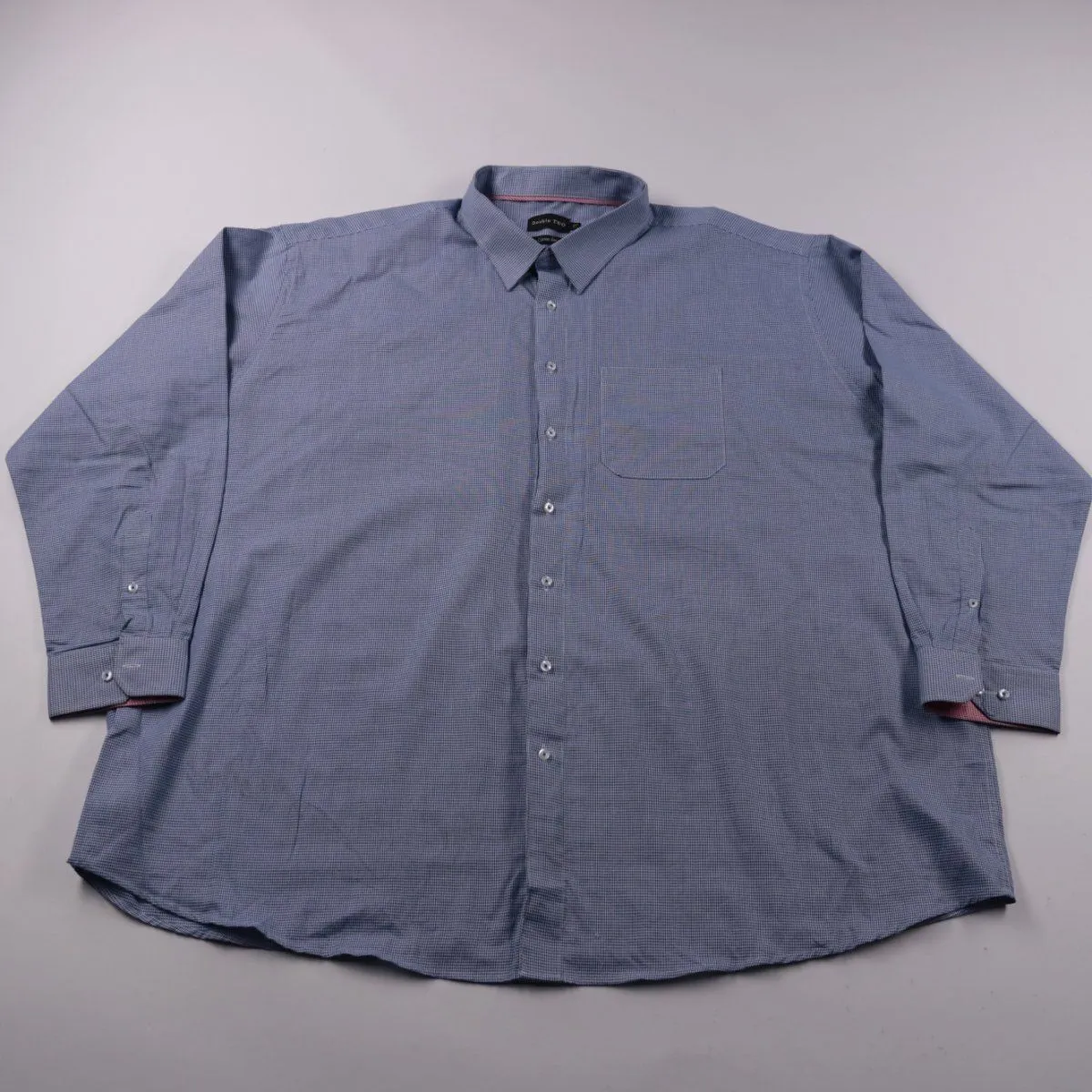 Мужская рубашка Double Two из хлопка с мелким сине-белым узором и нагрудным карманом. Подойдёт для офиса и повседневной носки, легко сочетается с брюками и джинсами. Материал easy care проще в уходе и меньше мнётся.
