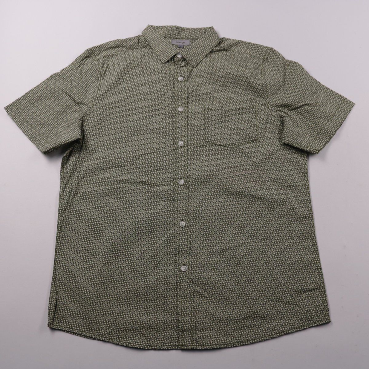 Мужская рубашка George с коротким рукавом и мелким геометрическим принтом в зелёных тонах. Подойдёт для лета и тёплой погоды, на каждый день или в офис в стиле casual. Ткань из 100% хлопка хорошо дышит и комфортна в носке.