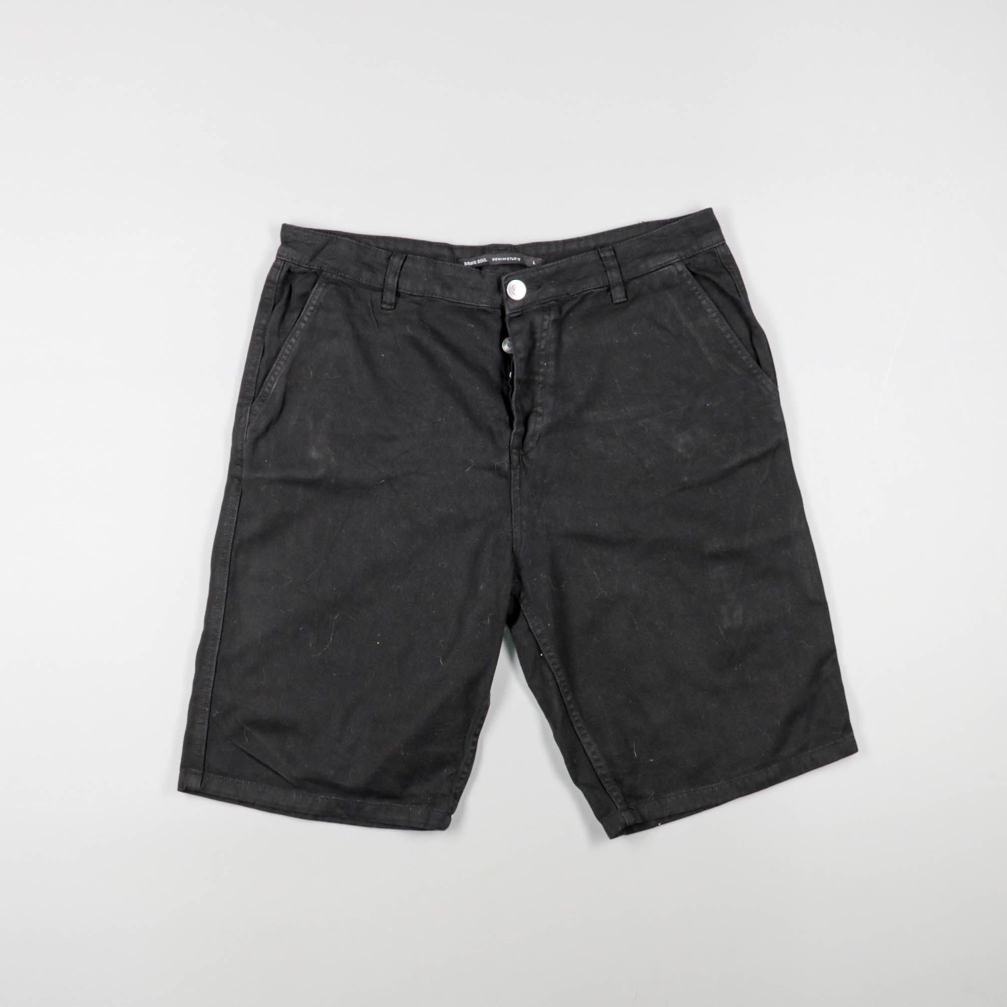 Мужские шорты чёрного цвета из плотной ткани, с застёжкой на пуговицу и карманами (в том числе накладным сбоку). Подойдут для повседневной носки летом и в поездках. Практичны тем, что имеют несколько удобных карманов для мелочей.