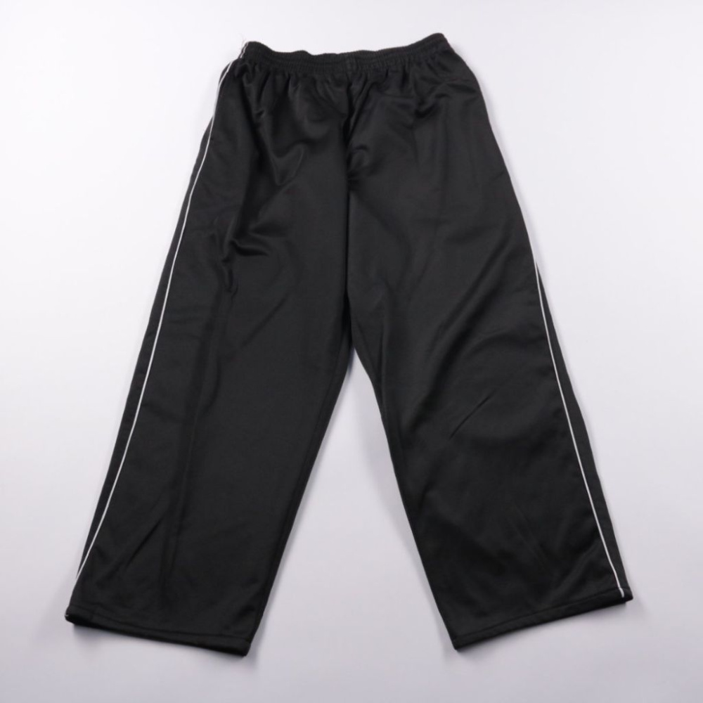 Спортивные брюки на резинке, чёрного цвета с тонкими боковыми полосами. Подойдут для тренировок, прогулок и домашней носки. Лёгкая синтетическая ткань быстро сохнет и проста в уходе.