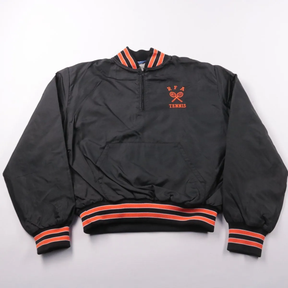 Мужская лёгкая куртка-анорак Holloway в чёрном цвете с вышивкой «RFA Tennis» и короткой молнией на воротнике. Подойдёт для прогулок и активного отдыха в прохладную погоду; эластичные манжеты и низ в полоску помогают лучше удерживать тепло. Удобный передний карман-кенгуру для рук и мелочей.