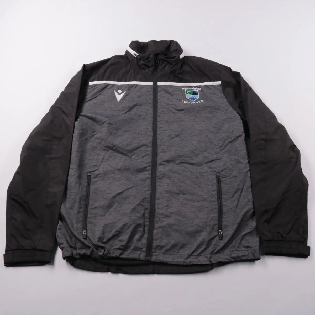 Мужская куртка Macron на молнии, серо-чёрная, с воротником-стойкой и карманами на молниях. Подойдёт для повседневной носки и тренировок в прохладную погоду. Лёгкий полиэстер быстро сохнет и прост в уходе.