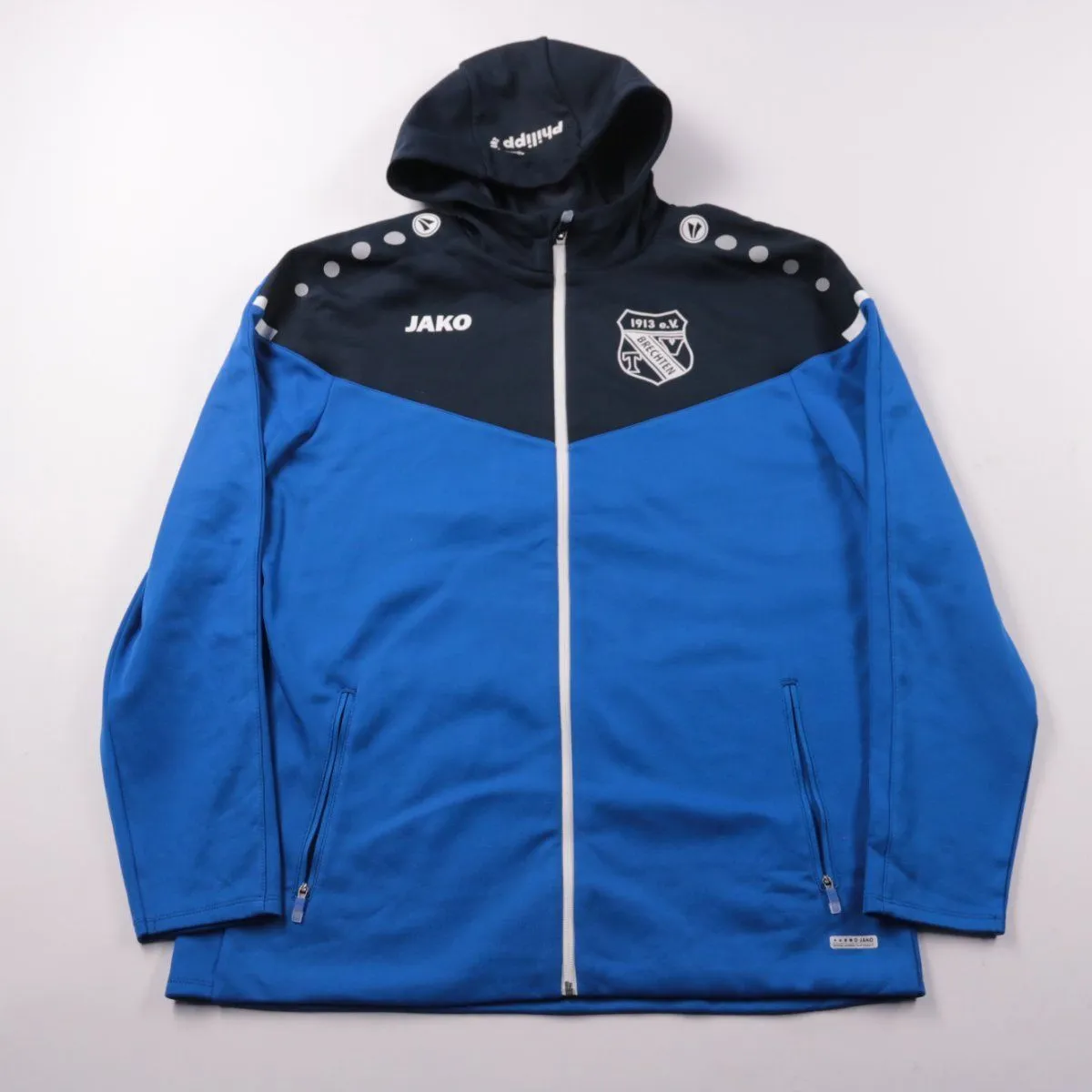 Мужская ветровка Jako на молнии с капюшоном, выполнена в сине-чёрном цвете. Подойдёт для тренировок и повседневной носки в прохладную погоду. Практичные карманы на молнии позволяют удобно хранить мелочи.