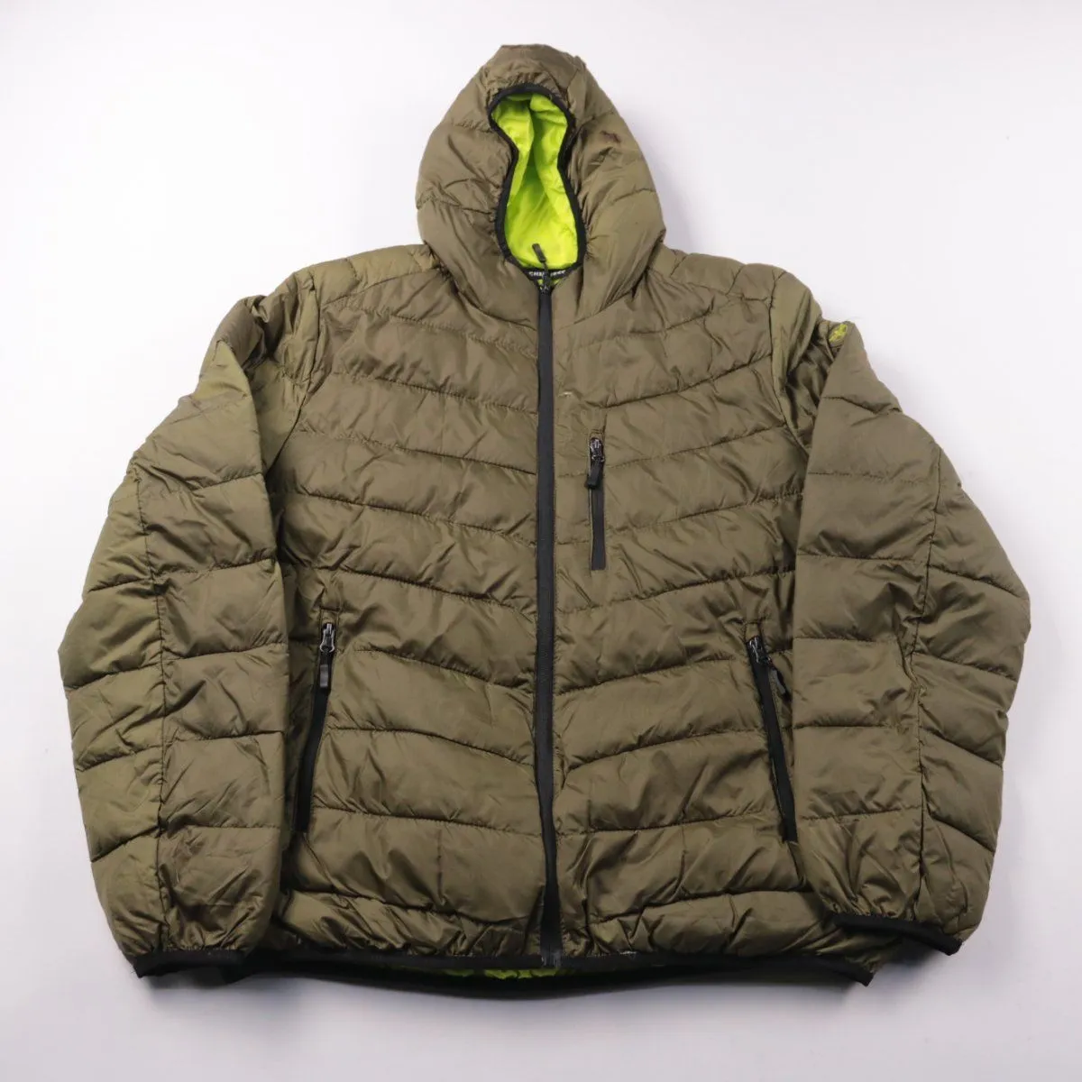 Мужской пуховик Chiemsee в цвете хаки с капюшоном и контрастной салатовой подкладкой. Подойдёт для зимних прогулок и повседневной носки, есть карманы на молниях и удобная центральная застёжка. Лёгкий и компактно складывается, хорошо держит тепло за счёт стёганой конструкции.