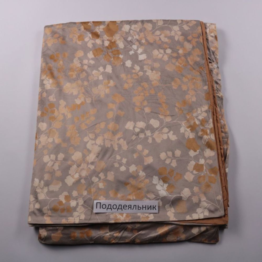Пододеяльник с цветочным принтом в серо-бежевых тонах, без указанного бренда. Подойдёт для спальни в спокойных нейтральных оттенках и на каждый день. Практичен тем, что двусторонний: можно менять вид за счёт однотонной коричневой стороны.