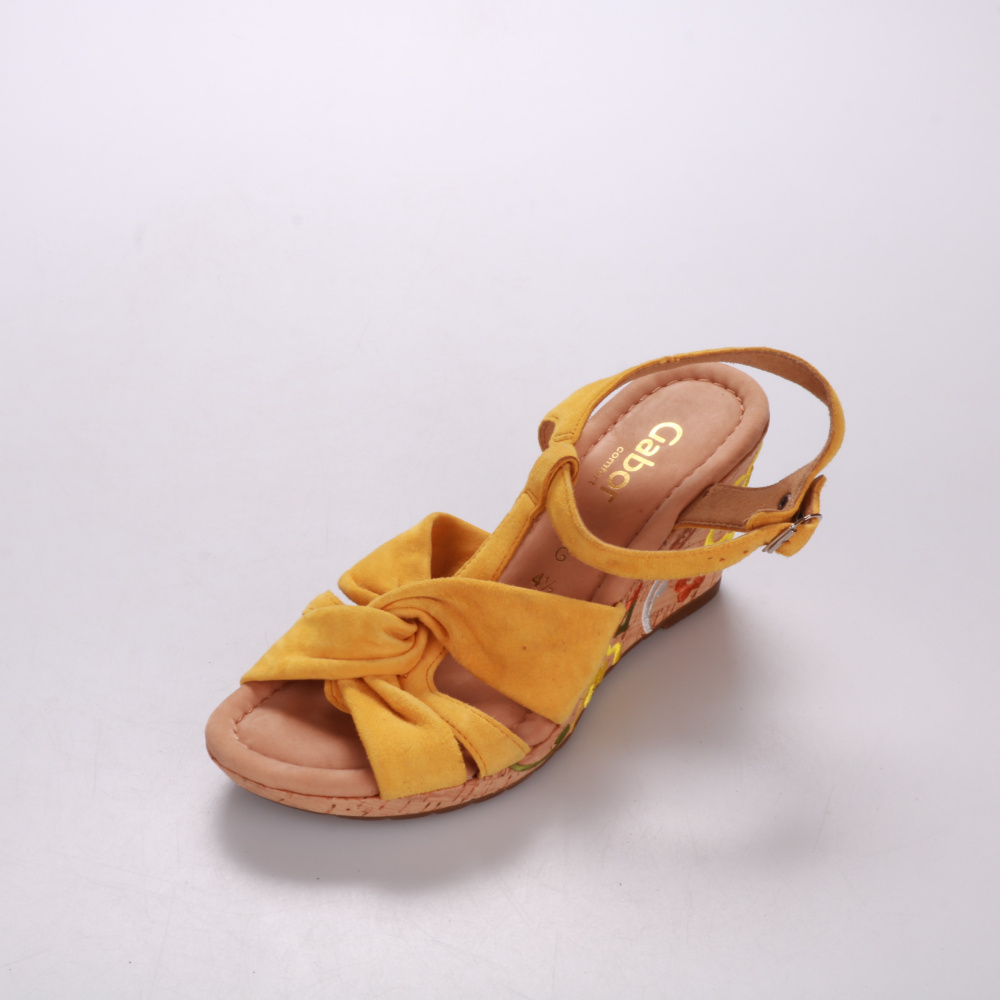 Женские босоножки Gabor на танкетке, в жёлтом цвете с текстильным верхом и эффектным узлом спереди. Подойдут для лета, прогулок и повседневных образов с платьями, юбками и джинсами. Танкетка добавляет устойчивости и визуально вытягивает силуэт.