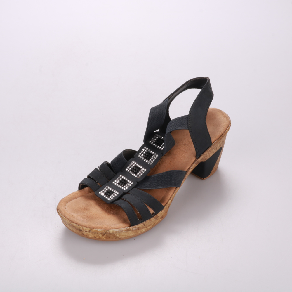 Черные босоножки на устойчивом каблуке с пробковой платформой и декором из страз на ремешке. Подойдут для летних прогулок и повседневных образов с платьями, юбками или джинсами. Удобная посадка за счет нескольких ремешков хорошо фиксирует стопу.
