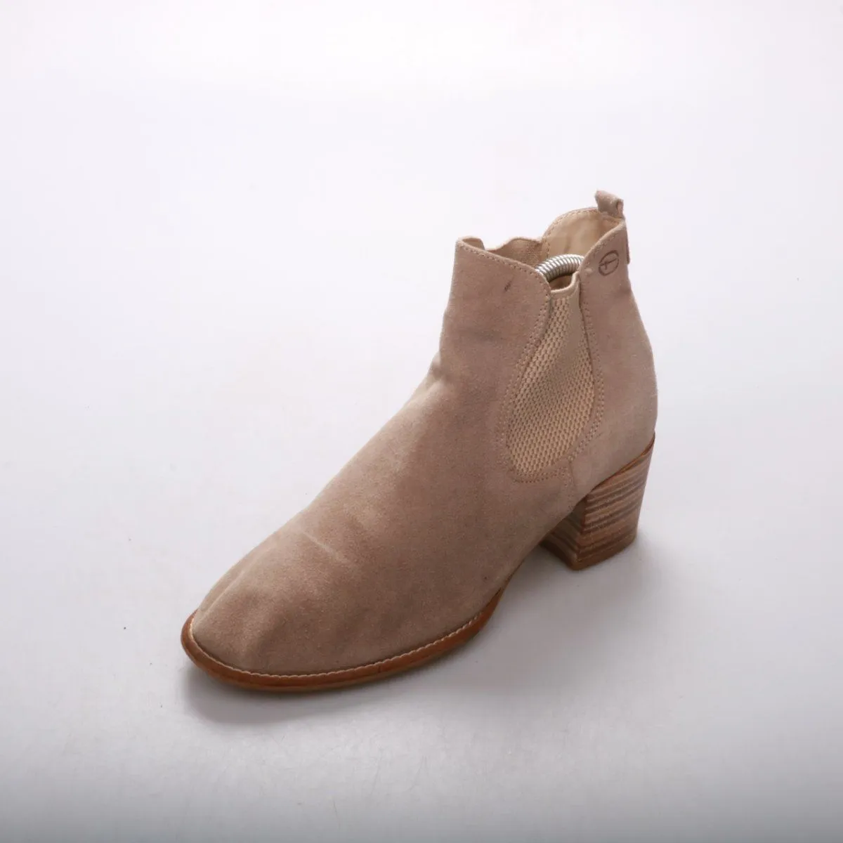 Женские бежевые ботильоны из замши на устойчивом каблуке с эластичными вставками по бокам. Подойдут для демисезона и повседневных образов с джинсами или платьем. Удобно надевать за счёт боковых резинок и устойчивой колодки.