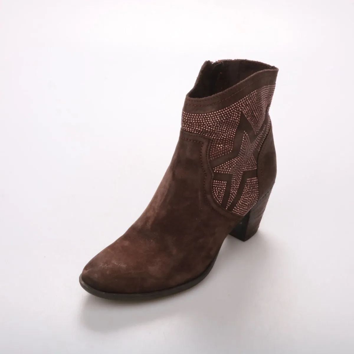 Женские ботильоны Tamaris из коричневой замши на устойчивом каблуке, с боковой молнией и декоративной отделкой стразами. Подойдут для повседневных образов с джинсами и платьями в прохладную погоду. Удобно надевать благодаря молнии и устойчивой колодке.