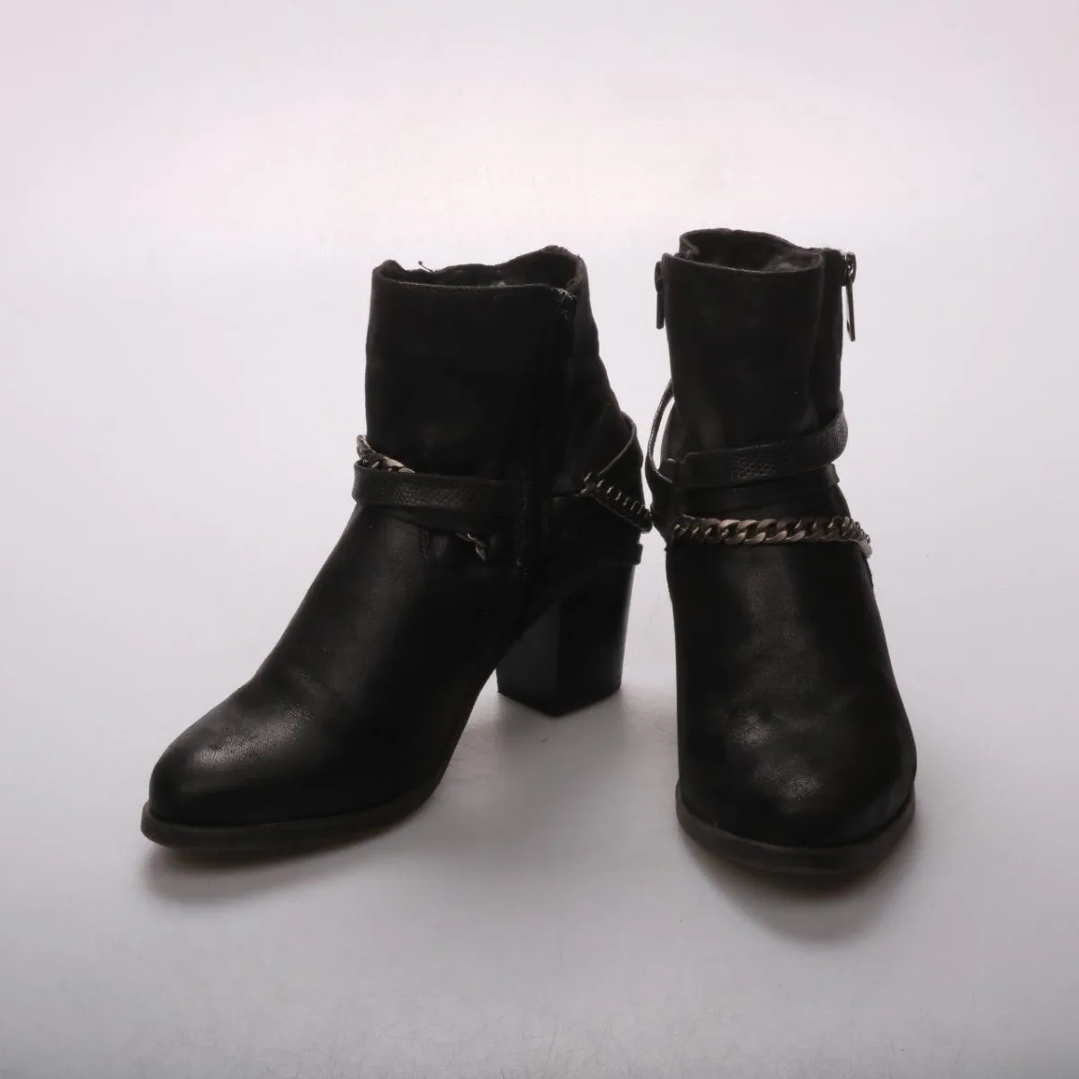 Ботильоны Jane Klain чёрного цвета на устойчивом каблуке, с боковой молнией и декоративной цепочкой. Подойдут для повседневной носки в прохладную погоду весной и осенью. Каблук-столбик удобнее для ходьбы по городу и даёт хорошую устойчивость.