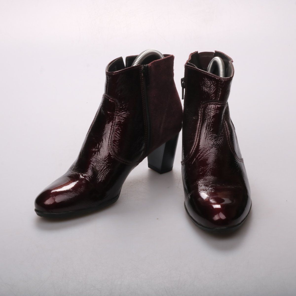Женские ботильоны Salamander из бордовой лаковой кожи с замшевыми вставками и застёжкой-молнией сбоку. Подойдут для повседневных образов в межсезонье и на выход, устойчивый каблук делает ходьбу комфортнее. Практичная резиновая подошва даёт хорошее сцепление с поверхностью.