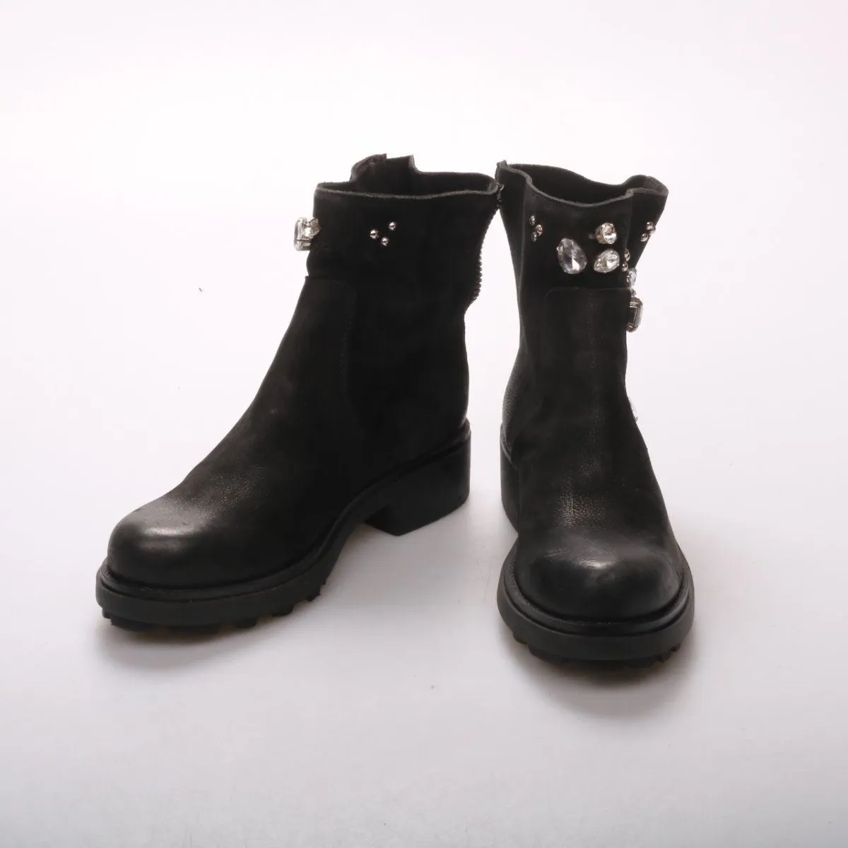 Женские ботильоны Onako из чёрной кожи с декором из страз и заклёпок на голенище. Подойдут для повседневных образов в демисезон и прохладную погоду. Практичное преимущество — удобная молния сзади и устойчивая подошва с выраженным протектором.