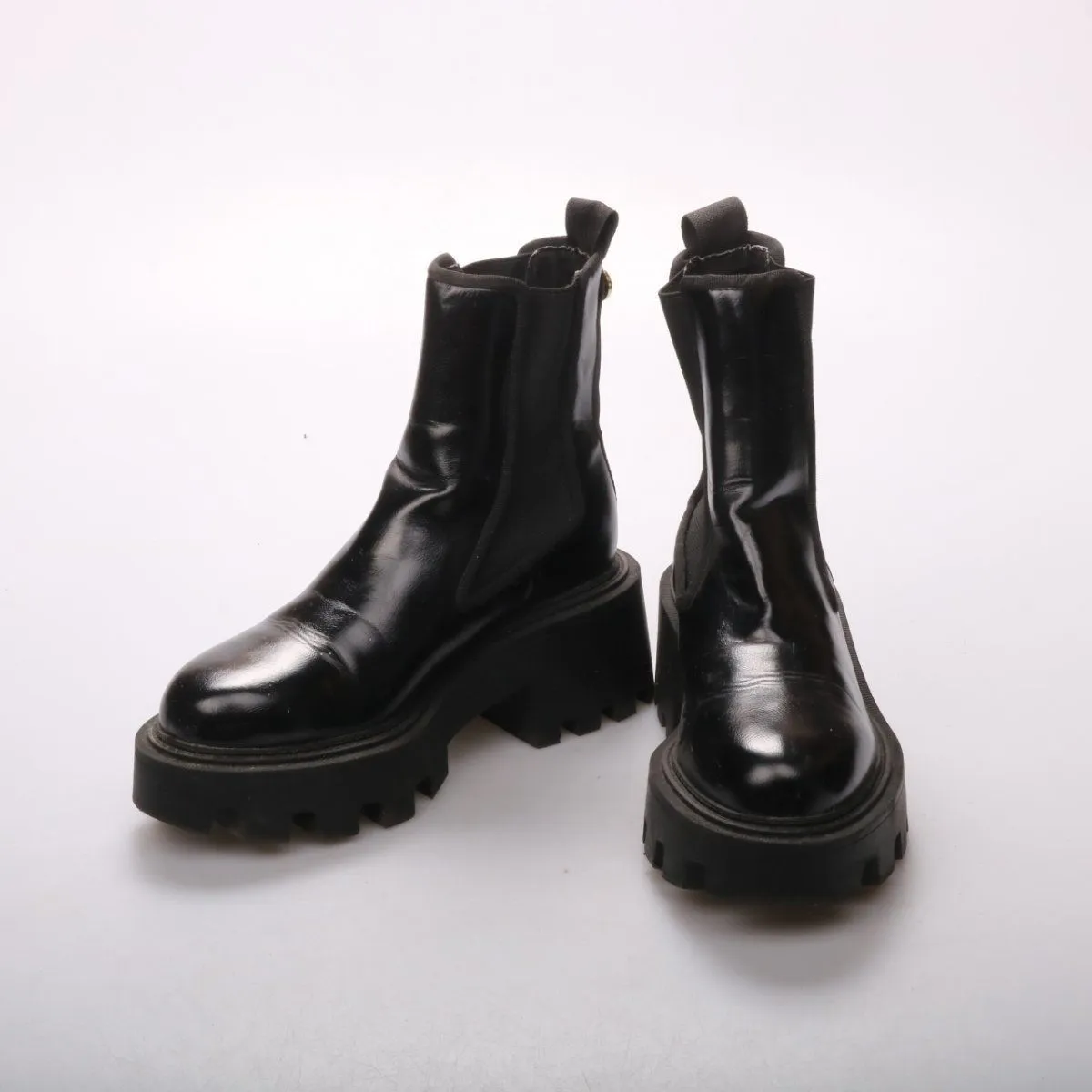 Ботильоны Zara из гладкого чёрного материала с эластичными вставками по бокам и петлями для удобного надевания. Подойдут на каждый день в межсезонье и для городских образов. Массивная тракторная подошва даёт хорошее сцепление и добавляет устойчивости.