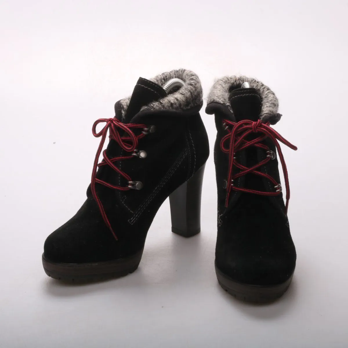 Женские ботильоны Tamaris из чёрной замши с серой меховой отделкой по верху и шнуровкой красного цвета. Подойдут для зимних городских образов и прогулок в прохладную погоду. Устойчивый высокий каблук и рельефная подошва дают хорошее сцепление и уверенную посадку на ноге.