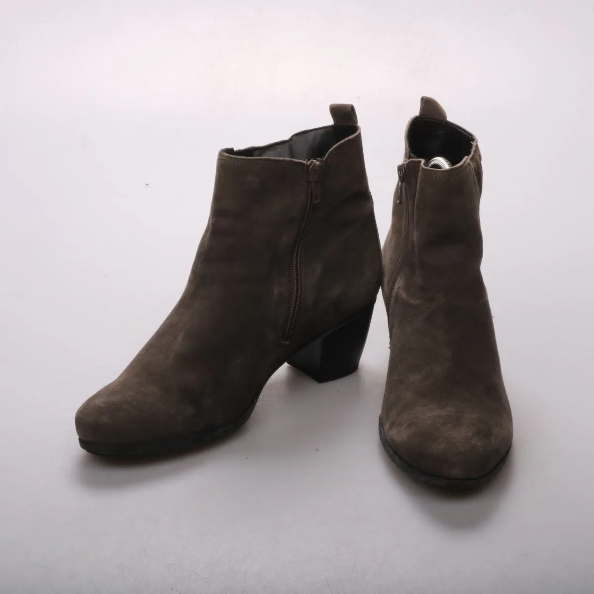 Женские ботильоны Gabor из замши коричневого цвета на устойчивом каблуке, с боковой молнией. Подойдут для повседневной носки в межсезонье с джинсами и платьями. Практичный плюс — удобная посадка и стабильный каблук для длительной ходьбы.