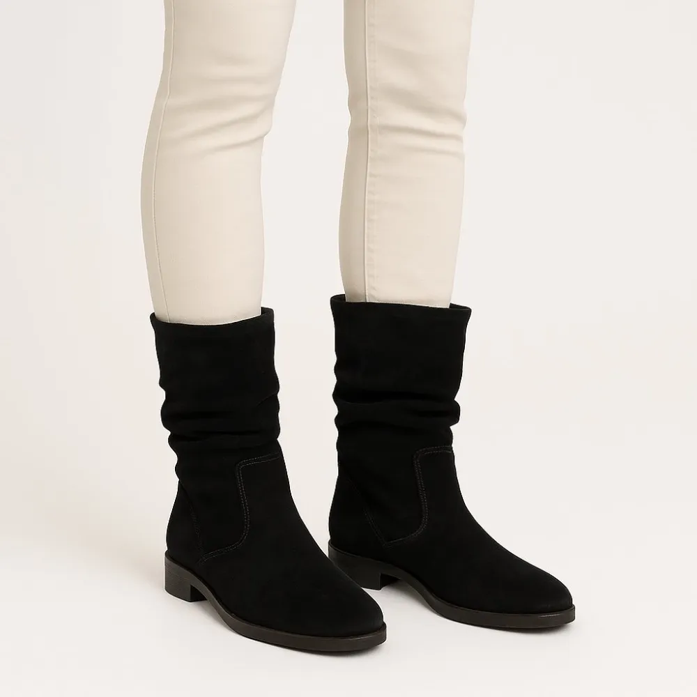 Женские ботинки Gabor из чёрной замши, укороченная модель со складками на голенище и боковой молнией. Подойдут на каждый день в демисезон, хорошо сочетаются с джинсами и платьями. Устойчивый низкий каблук и удобная посадка делают их практичными для про...