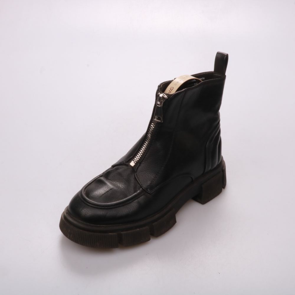 Женские ботинки Zara из гладкой чёрной эко-кожи с центральной молнией и массивной рифлёной подошвой. Подойдут на каждый день в прохладную погоду — с джинсами, брюками или платьем. Удобно быстро надевать за счёт молнии и петли на пятке.