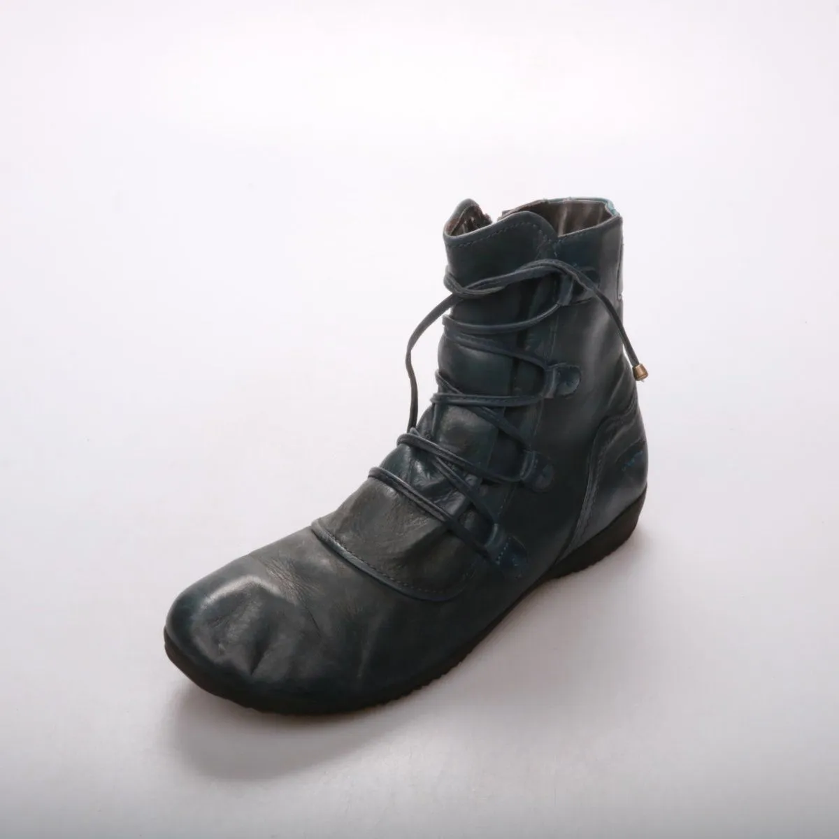 Женские ботинки на шнуровке с боковой молнией, без выраженного каблука. Подойдут на каждый день в прохладную погоду под джинсы или брюки. Практичная рифлёная подошва даёт более уверенное сцепление и удобна для длительной ходьбы.