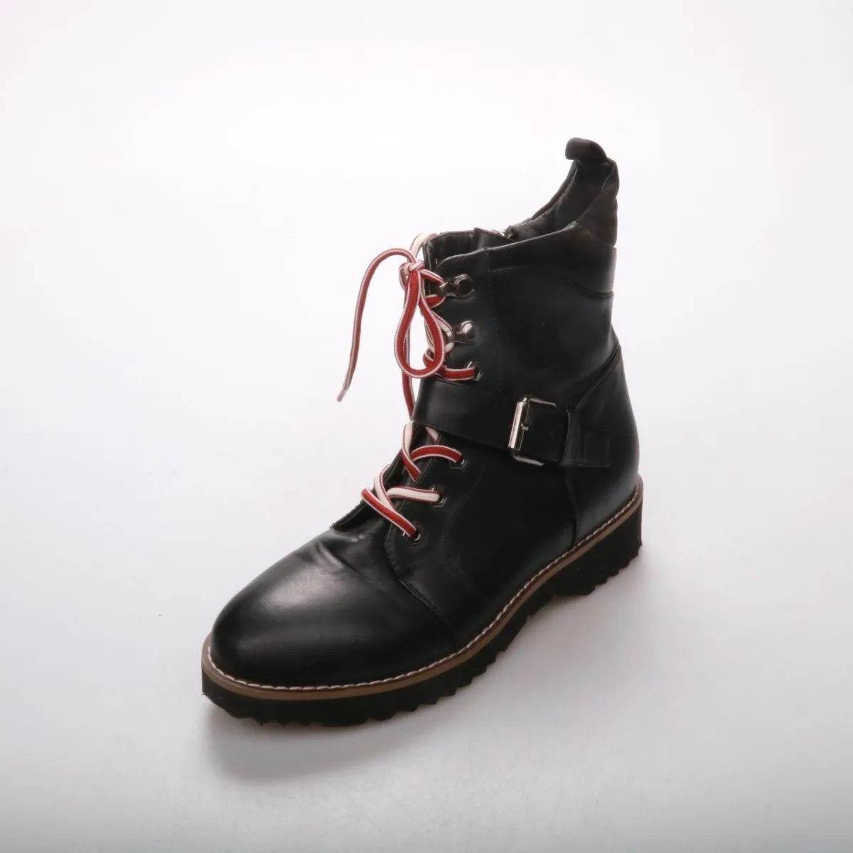 Женские ботинки на шнуровке с боковой молнией и ремешком с пряжкой. Подойдут для повседневной носки в прохладную погоду и межсезонье. Толстая рифлёная подошва лучше держит сцепление и устойчивее на мокрой дороге.