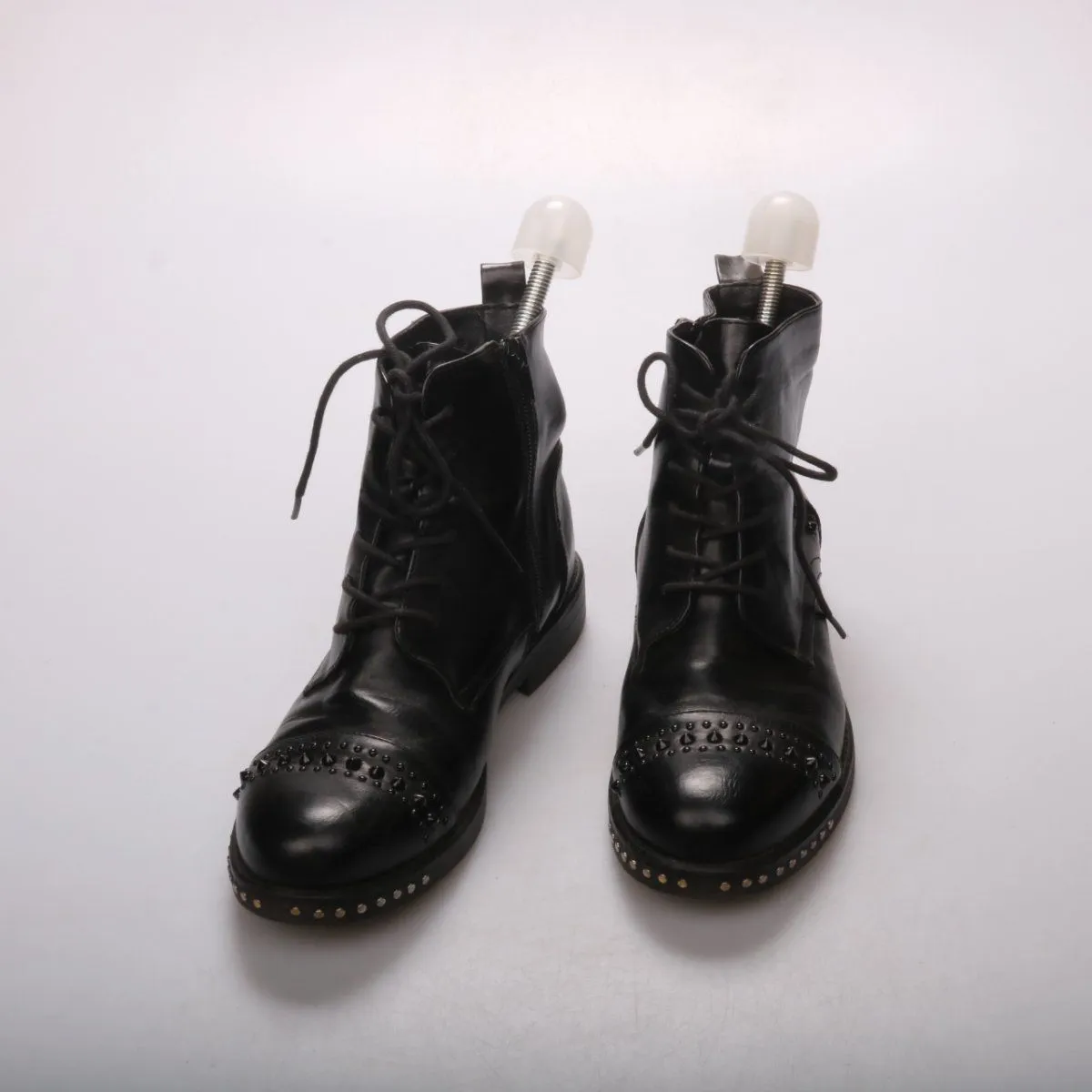 Черные кожаные ботинки на шнуровке с боковой молнией и декором из заклепок на мысе и по ранту. Подойдут для повседневной носки в городе в прохладную погоду и сочетаются с джинсами и платьями. Практичное преимущество — устойчивая подошва и удобная фиксация за счёт шнуровки.